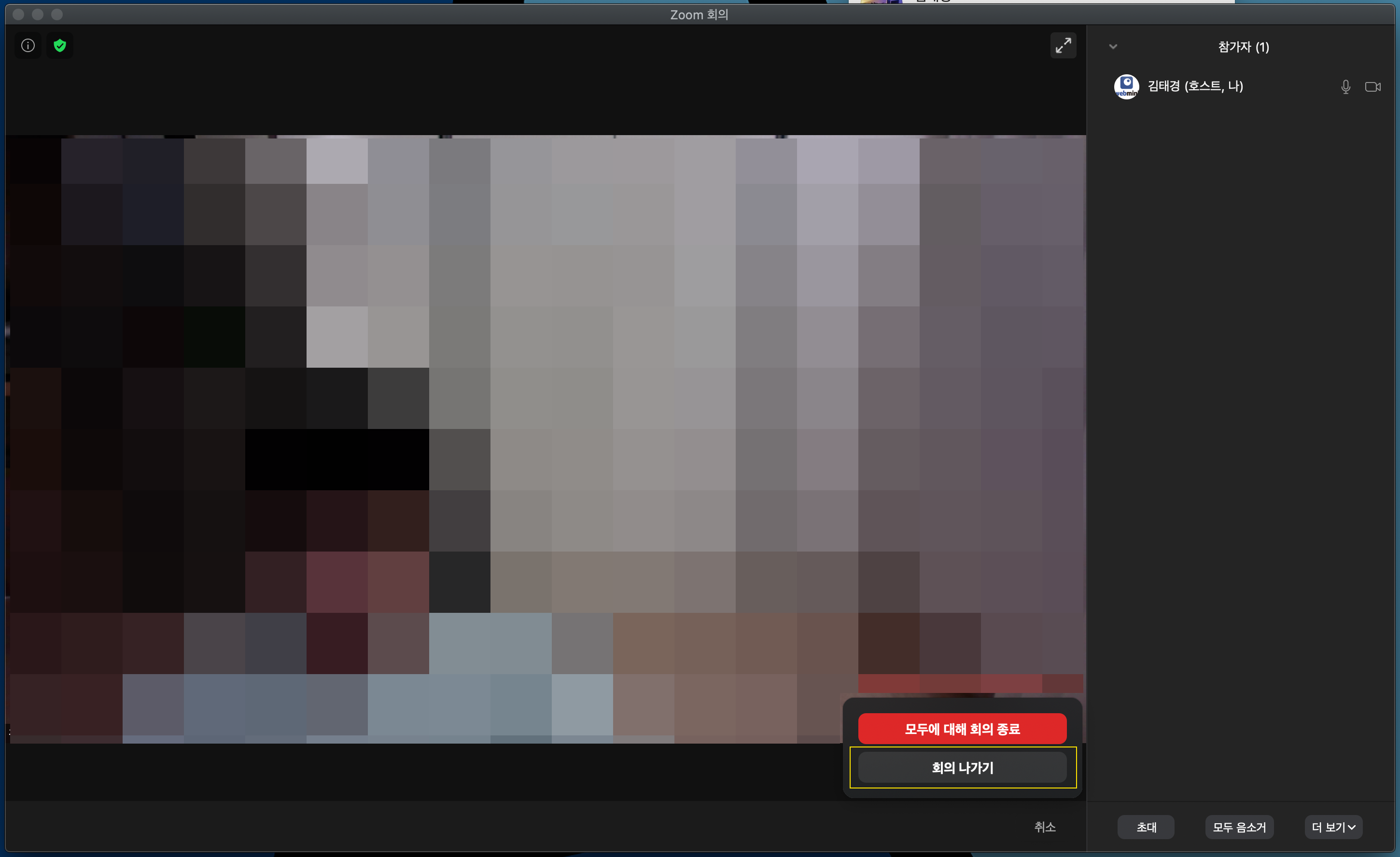 주의 사항은 '모두에 대해 회의 종료'를 할경우 새로 회의실을 만들어야함으로 공유됐던 링크와 아이디가 바뀌오니, 앞으로도 계속 그 회의를 유지 하실거면 '회의 나가기'를 하셔야합니다.