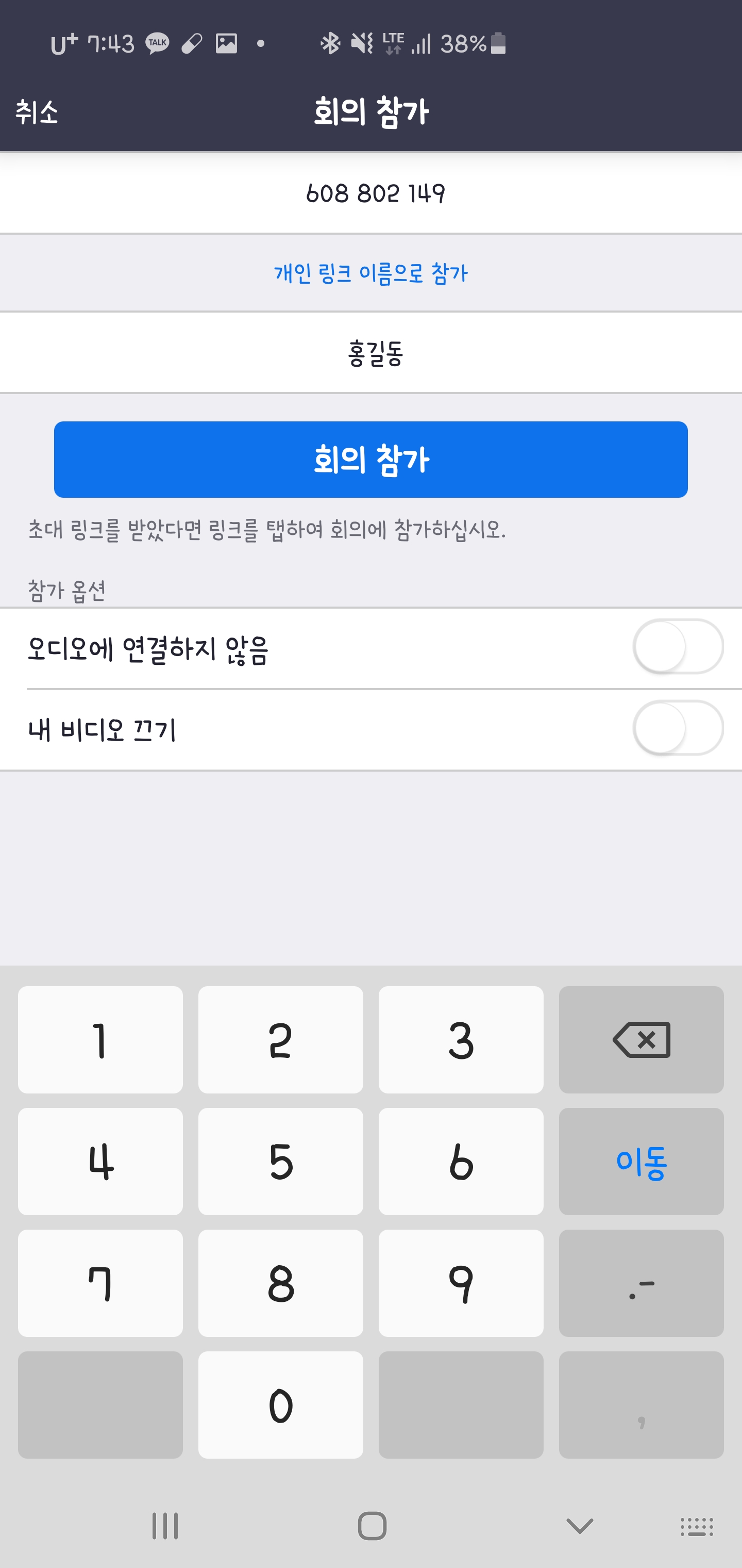 주의할부분이 회의참가창에서 '오디오에 연결하지 않음'과 '내 비디오 끄기' 체크 해제를 해주셔야합니다.