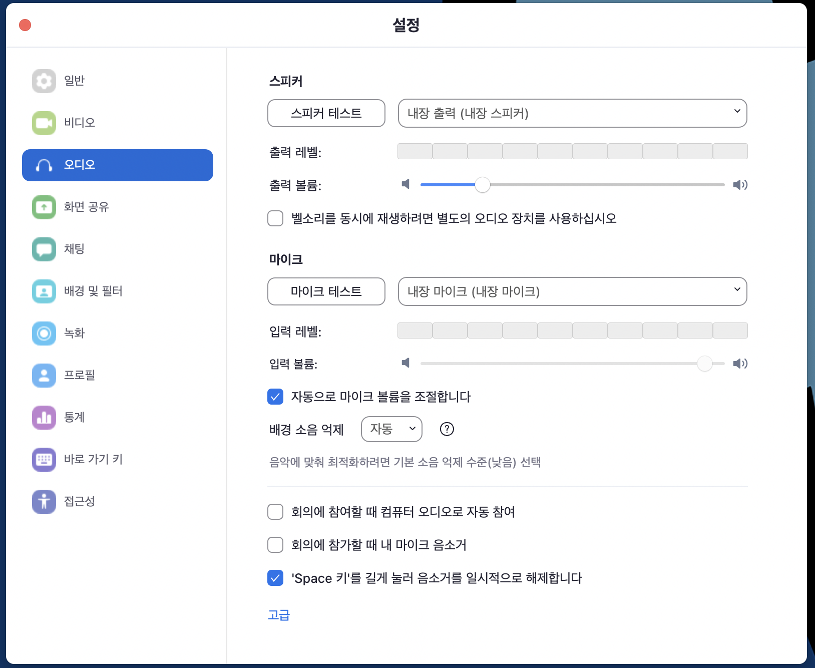 체크할경우 오디오와 비디오가 주최자 화면에 안보일 수 있습니다.