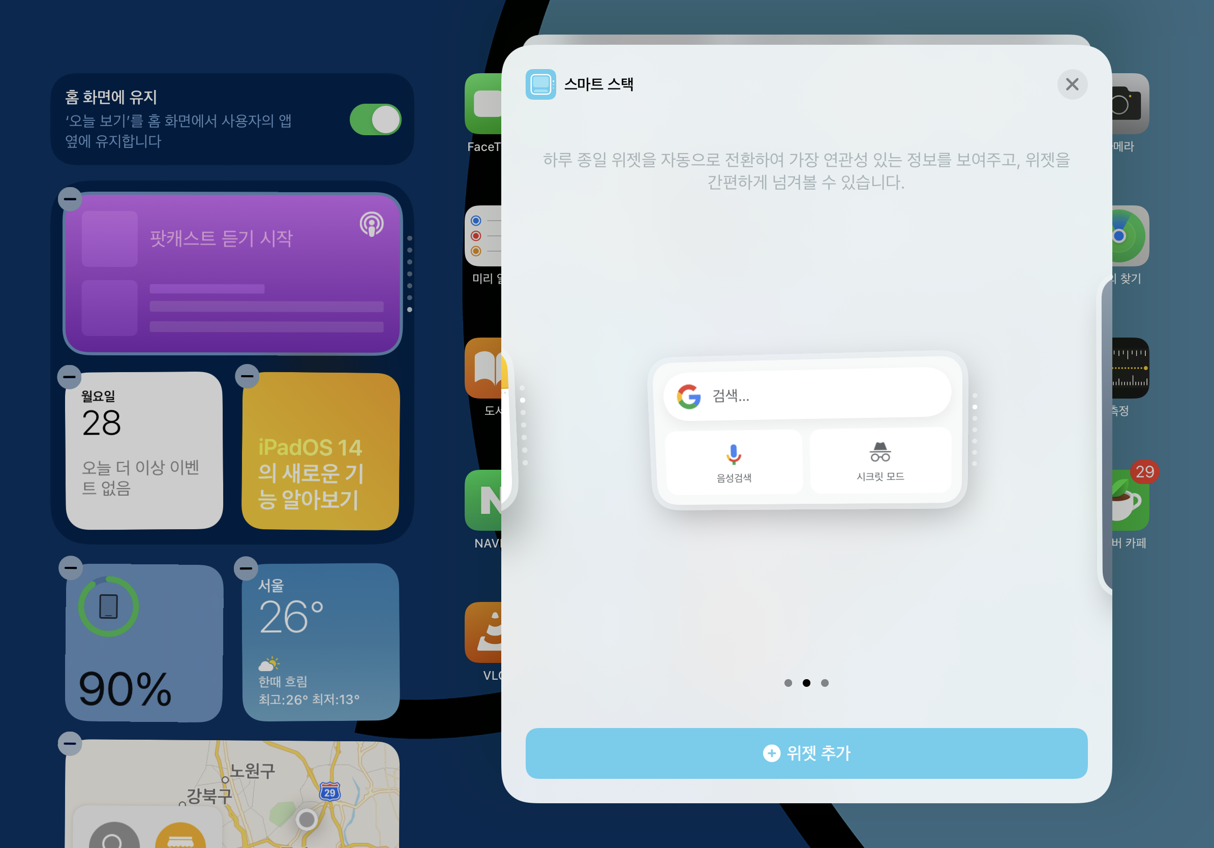 홈 화면을 길게 누르고, '+'를 눌러서 스마트 스택 위젯을 추가하시면 됩니다.