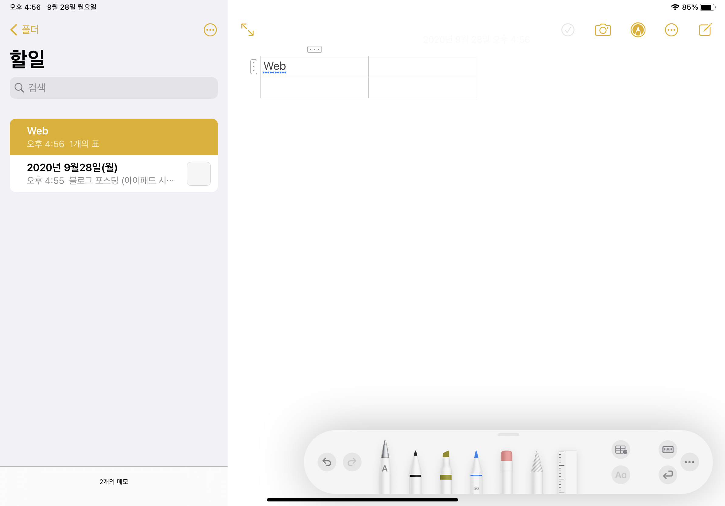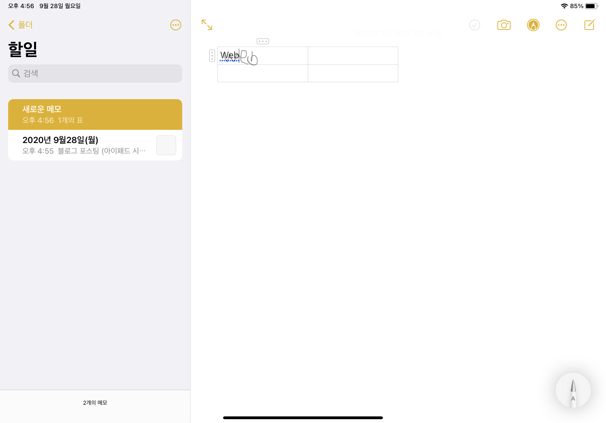 그리고 메모장 애플 펜슬 기능에서 A라고 쓰여있는 펜슬이 추가가 되었는데요.