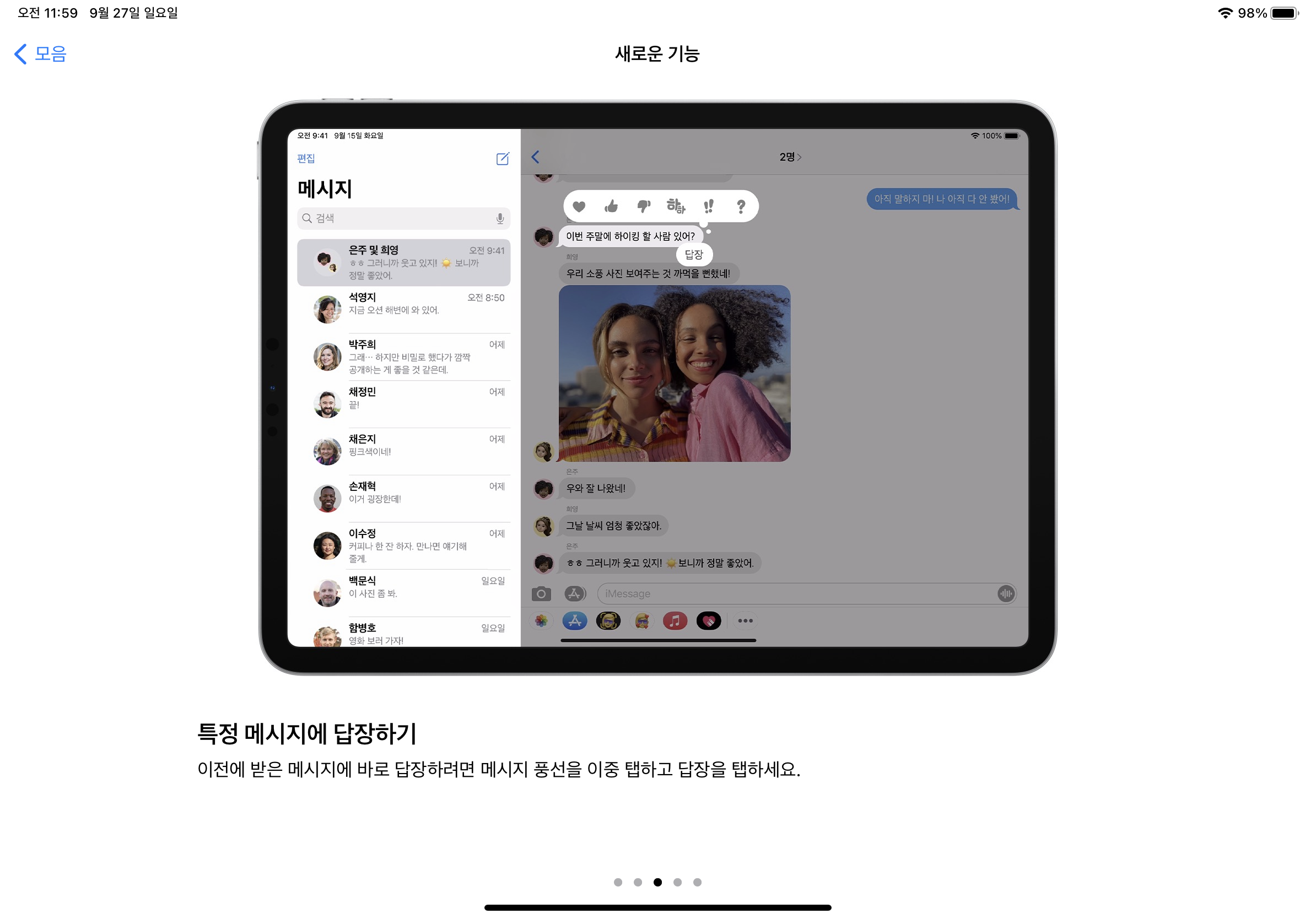 카카오 답장하기처럼 특정 메시지의 풍선을 이중 탭 하면 답장을 하실 수 있습니다.