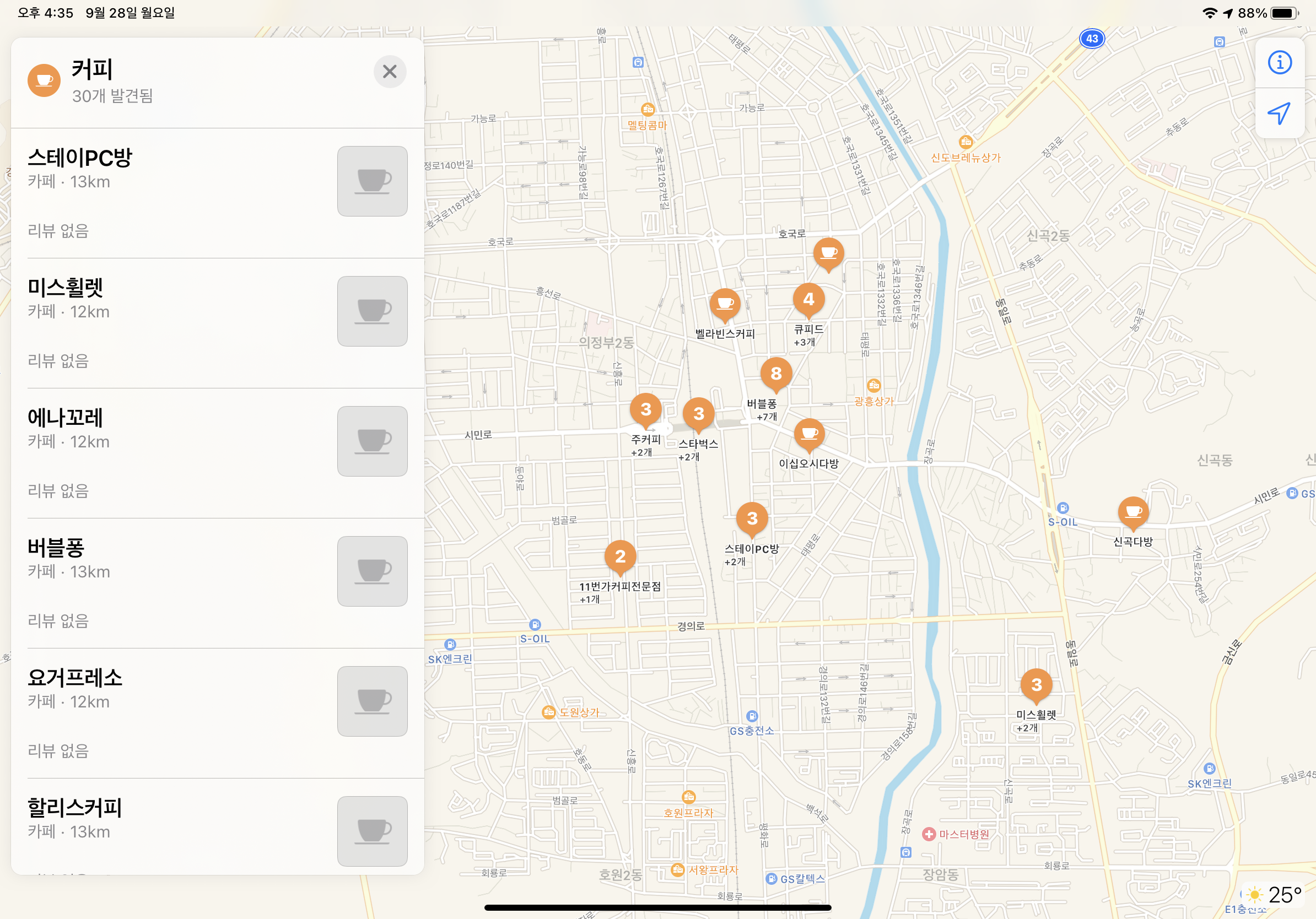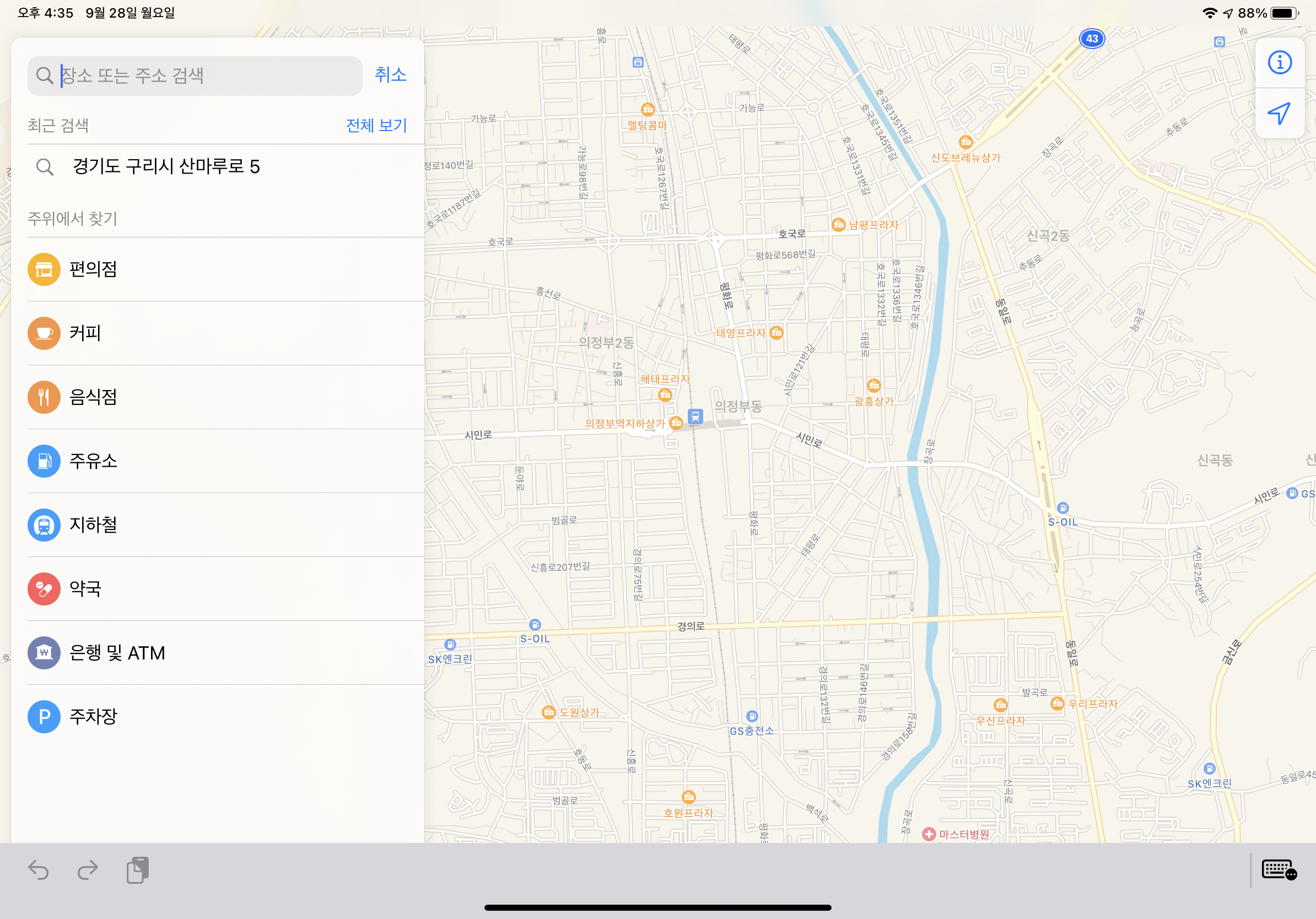 검색을 탭 하면 편의점등 여러 상가 정보와 편의 시설들을 찾을 수 있고, 카테고리를 탭 하면 아래와 같이 해당 상세정보와 위치를 찾을 수 있었습니다.