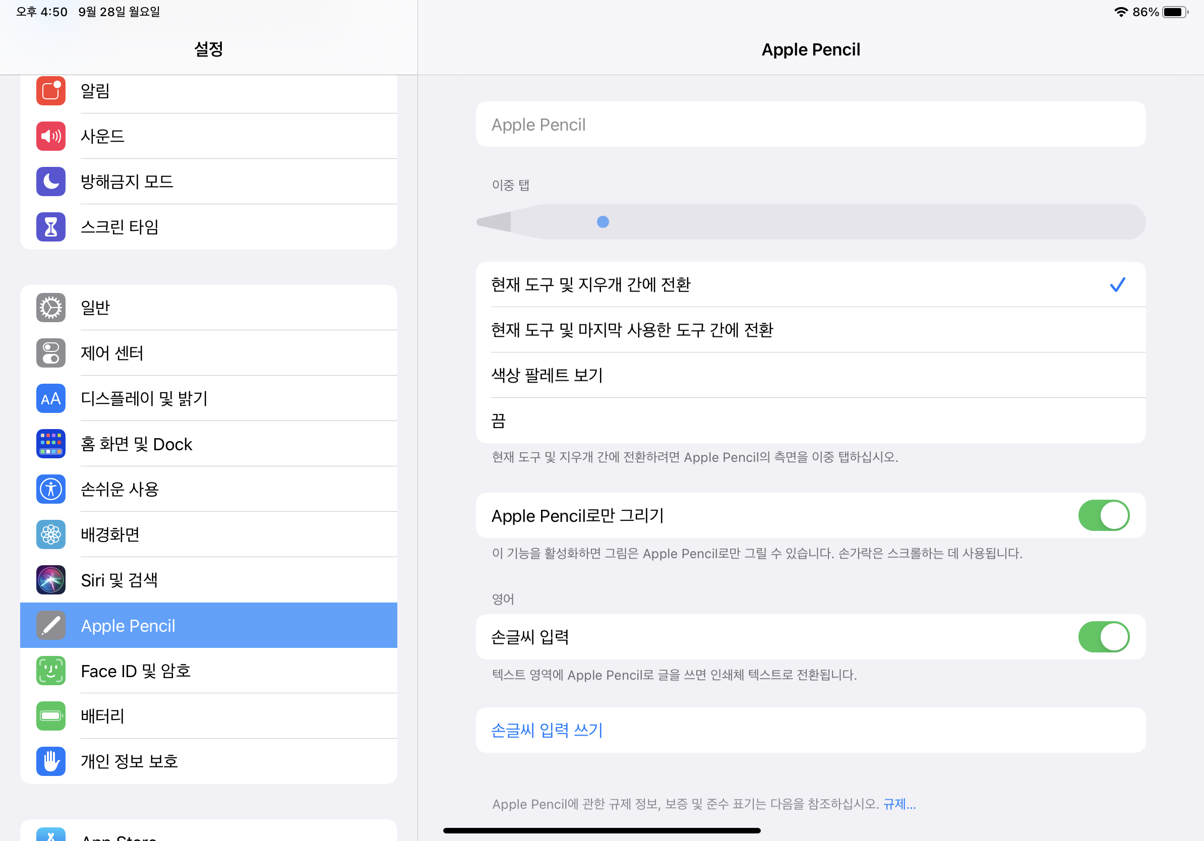손글씨 입력은 설정 > Apple Pencil > 손글씨 입력 부분에서 활성화할 수 있습니다.