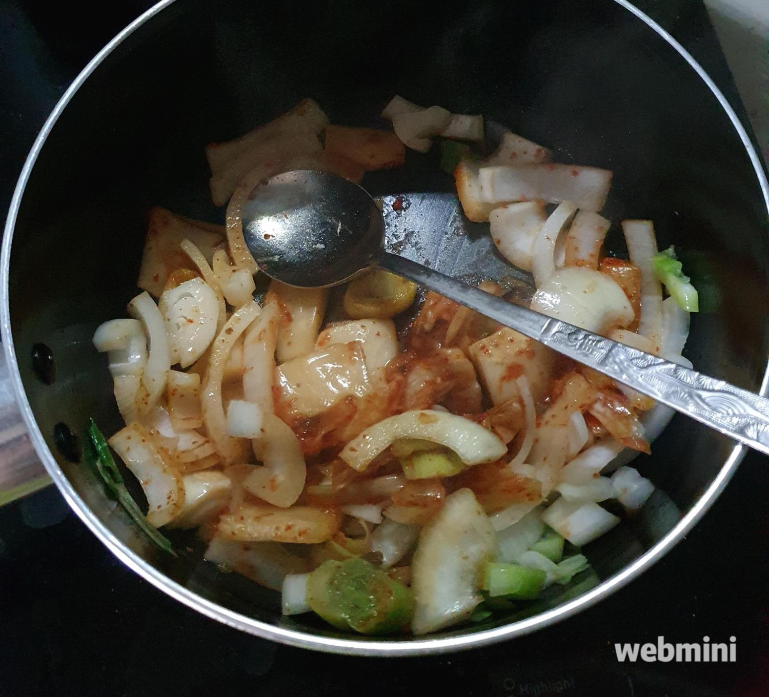 그리고 어느정도 익었을때 잘게썬 김치를 넣고 볶습니다.