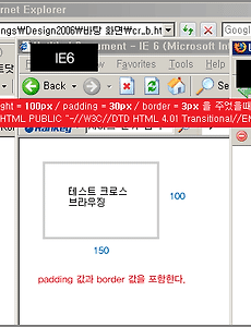 58%Sale webmini life기간 :~12.31 스킨 특징보기 블로그 리뷰 문의 정성들여 제품 리뷰해 드립니다. 리뷰 문의하기 DTD1 728x90 [잡담]DTD에 따른 브라우저 박스크기변화 먼저 이글은 http://zine.standardmag.org/200802/20 와 같은 내용임을 알려 드리며 다시한번 테스트 해본 결과입니다. 크로스브라우징으로 인해 시간낭비 및 생각하지 않던 것들때문에 야근을 하는 경우가 종종 발생하죠. 참 안타까운 현실입니다. 알려진 크로스브라우징 팁 가운데 DTD의 선택도 중요한 부분을 차지 하고 있다는건 여러 글들을 통해 접했으리라 생각합니다. 그래서 DTD에 따른 박스크기 변화를 다시한번 테스트해 보았습니다. 테스트 박스는 공통적으로 width = 150px / height = 100px / padding = 30px / border = 3px 값을 주었을때 입니다. 먼저 DTD를 로 했을 경우에 결과입니다. 소스는 다음과 같습니다. 테스트 크로스 브라우징 보.. 반응형 이전 1 다음